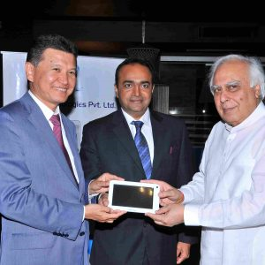 President of FIDE & former President of Kalmykia Mr Kirsan Ilyumzhinov with Prashant Tewari & Mr Kapil Sibal Minister of Telecom in New Delhi on 24 June 2013 at a function organised by OPINION EXPRESS & Pantel Technologies