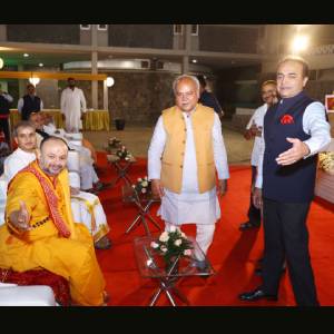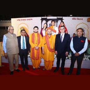L-R: Shri KN Ranganathan Founder FOTUS ( Friends of the United States of America ), Mr A Sukesh Political Advisor, H.H Dwarkeshlalji Maharaj with family, Mr Graham Mayor Minister Counselor for Political Affairs US Embassy in India, Mr Prashant Tewari Editor-in-Chief of Opinion Express at a function hosted by Opinion Express at IIC New Delhi.