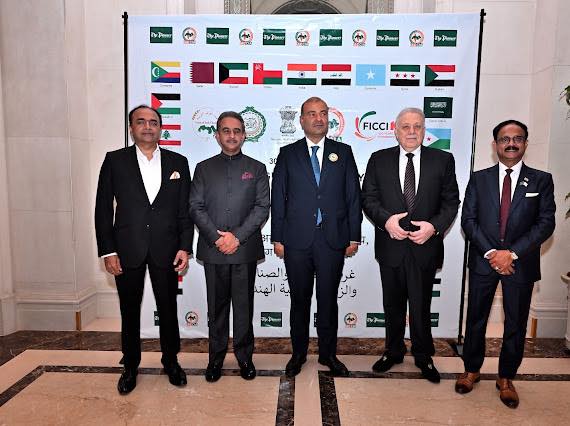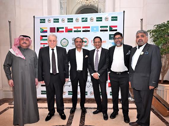 L-R: Amb Kuwait, Dr Awwad, Prashant Tewari, Shishir Priyadarshi, Kushan Mitra at the venue of Pioneer IACCIA India Arab Summit 2026